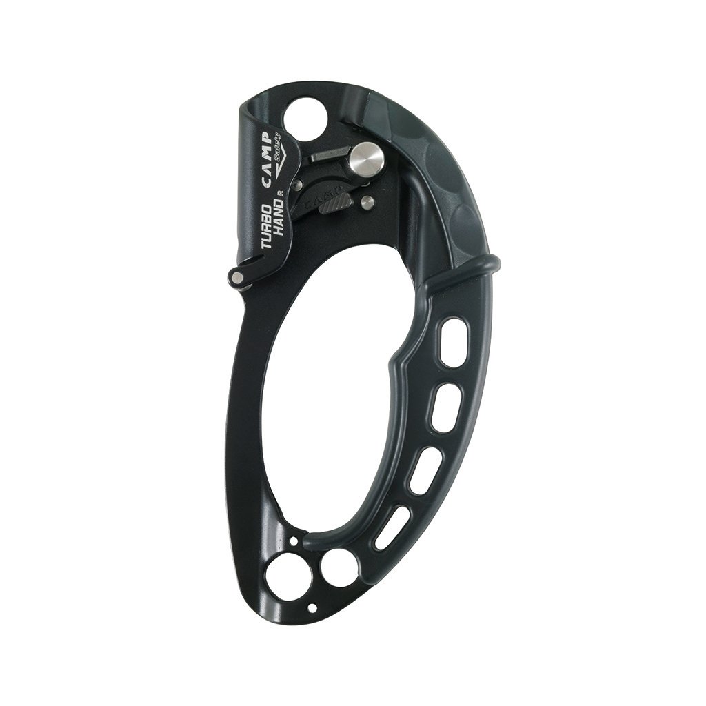 Turbohand Black je černá varianta ručního blokantu CAMP Turbohand, který usnadňuje výstup na laně. Využívá špičkovou technologii a inovovanou konstrukci, díky které je výstup bezpečnější, rychlejší a navíc šetrný k lanu. Využívá patentovanou rolničku, která nejen pomáhá plynulejšímu pohybu po laně, ale také snižuje tření a tím pádem také nebezpečí poškození lana. Ergonomická pogumovaná rukojeť sahá až na vrchní část blokantu, což velmi zefektivňuje použití druhé ruky k výstupu nahoru. Blokant CAMP Turbohand Black je při výstupu v rovnoběžné pozici s lanem, čímž je zaručeno nejlepší a nejefektivnější stoupání. Pro optimální organizaci doplňků slouží tři velká oka, dva na spodní a jeden na vrchní části blokantu. Blokant Turbohand Black je ve verzi pro pravou i levou ruku a je vhodný pro lana od 8mm do 13mm. Robustní tělo je vyrobené ze 3,5mm silné hliníkové slitiny. Ozubená vačka má speciální povrchovou úpravou proti opotřebení a je opatřena otvory, které pomáhají zabránit hromadění nečistot. Otevírací systém je chráněn proti náhodnému otevření z obou stran. Přítomnost rolničky také umožňuje použít Turbohand Black jako blokovací kladku při zatížení do 50kg. POZOR: Tato konfigurace neumožňuje použití blokantu pro tahání nebo zajištění osob. Ocelový pomocník (Turbohand Guide, prodává se samostatně) může být přidán pomocí dvou šroubů na spodní část blokantu pro lepší stabilitu lana při dlouhých výstupech.