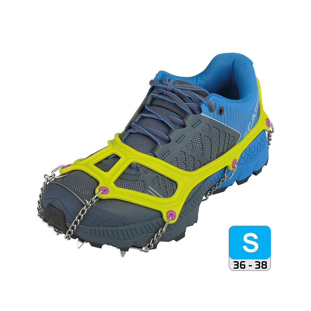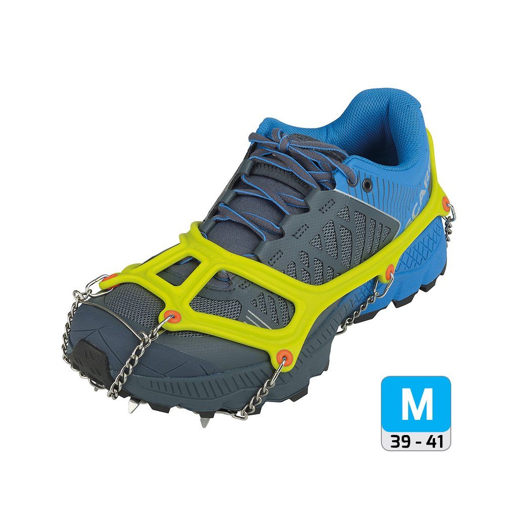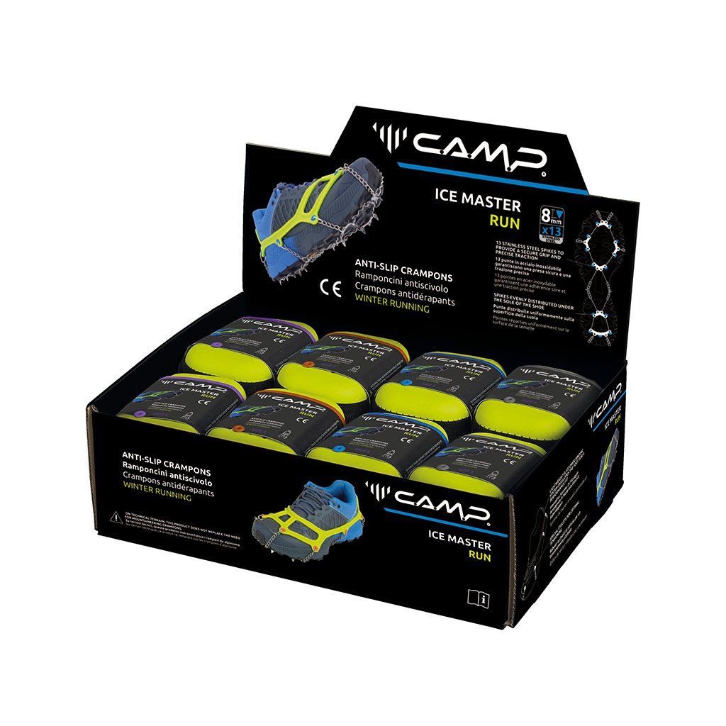 Ice Master Run jsou extrémně lehké nesmeky speciálně upravené pro zimní běhání. Nesmeky mají 13 hrotů z nerezové oceli. Pro potřeby běhání byly hroty zkráceny na 8mm a úpravou prošly i spojovací řetízky, které byly zúženy. Nejen že je tato verze je ze všech nabízených variant nesmeků CAMP Ice Master nejlehčí (váží pouhých 172g), ale je i nejkompaktnější. Rovnoměrné rozmístění hrotů zaručuje maximálně efektivní účinnost při kontaktu s kluzkým povrchem. Inovované upevnění k běžecké botě je zajištěno pomocí pružného elastomeru, který dokonale obepíná botu (je nutné jen podle boty zvolit tu správnou velikost). Nazouvání zvládnete snadno pomocí připraveného poutka na patě. Nesmeky Ice Master Run jsou vhodné jak pro zimní běhání, tak i pro zimní turistiku či mimosezónní vycházky kde vás může překvapit led. Ice Master Run jsou vhodné pro běžecké boty i pro nízké trekovky.