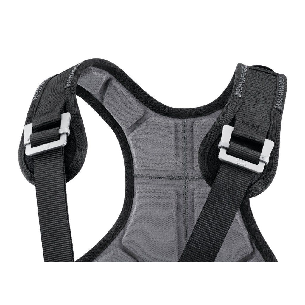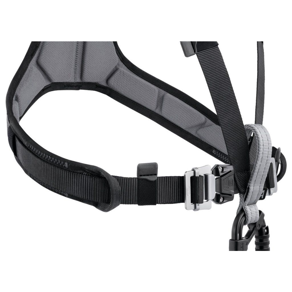 CHEST'AIR sa ľahko pripája k prednému pripojovaciemu bodu sedacieho postroja a rýchlo sa nasadzuje pomocou pracky FAST LT na hrudi. Samosvorné pracky DOUBLEBACK na ramenných popruhoch a hrudnom popruhu umožňujú ľahké prispôsobenie rôznym typom postavy.