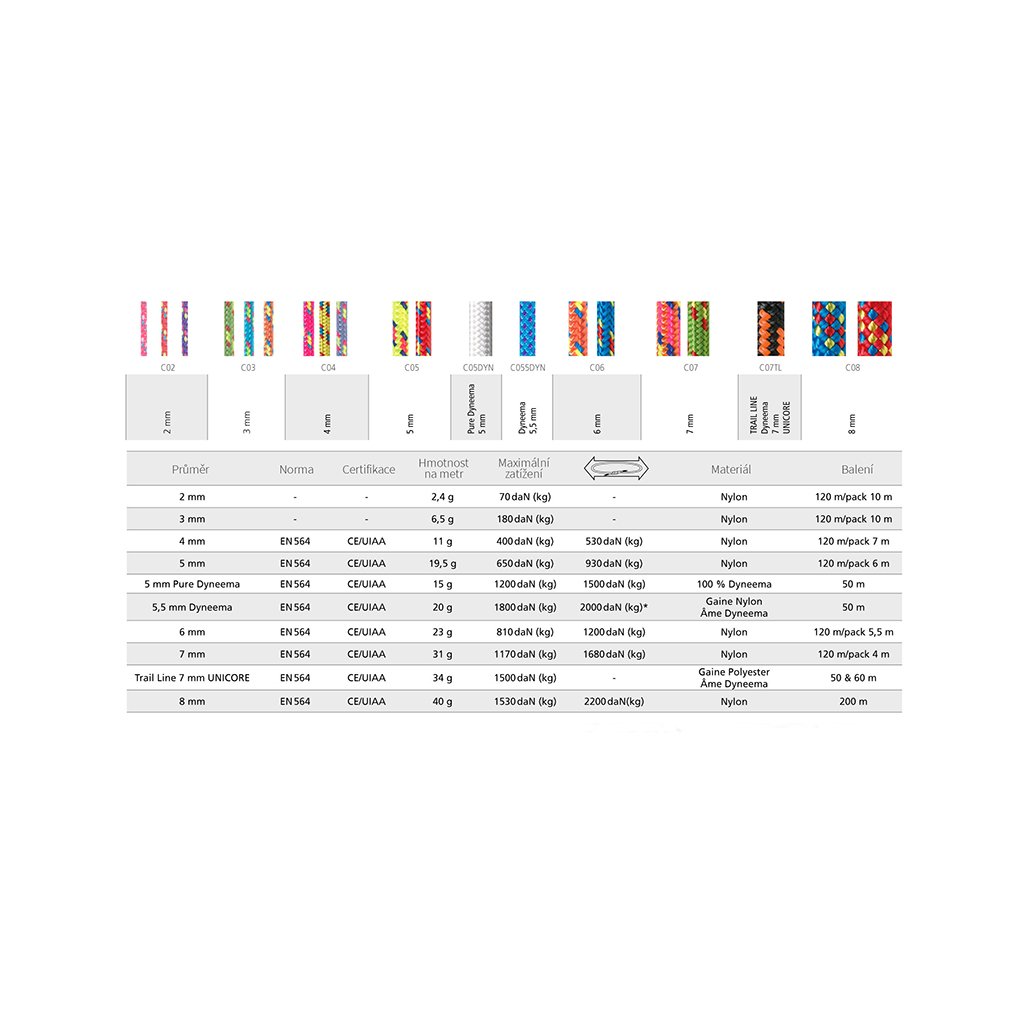 - Nosnost při použití jako smyčka 1500 daN (kg) - spojené pouze zapomocí rybářského uzle ("autíček")