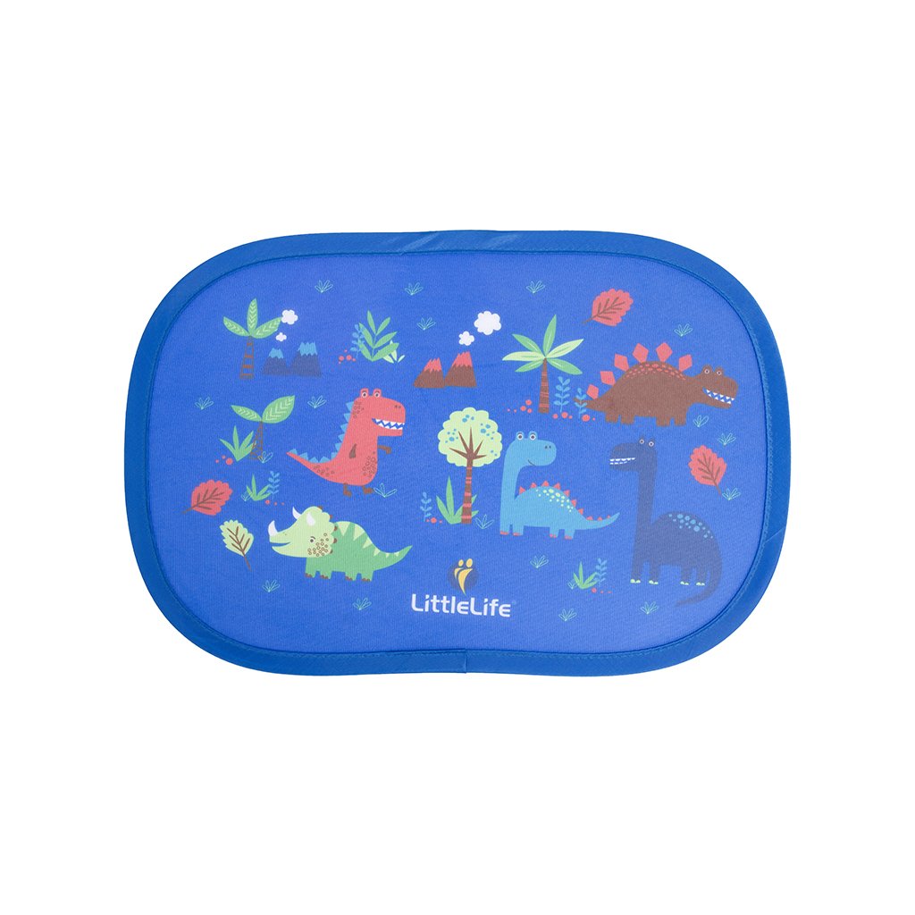 Sluneční clony do auta ze síťové tkaniny s dětským motivem dinosaurů. Speciální síťovina zabraňuje nepříjemnému oslnění Sluncem, ale nebrání výhledu. Jednoduché nalepení a sejmutí clon je umožněno pomocí statické elektřiny. Clony jsou dodávány v páru.